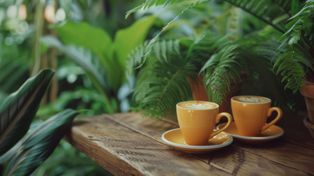 Two yellow coffee cups are placed on a wooden table in a lush green garden, surrounded by fresh ferns and plants
