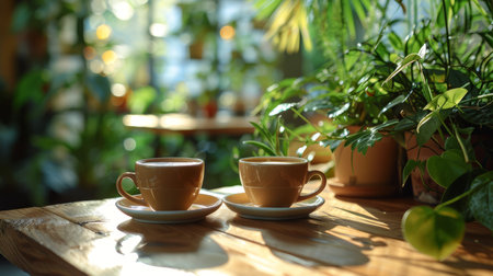 In a cozy coffee shop, two coffee cups rest on a wooden table near lush green plants, creating a warm atmosphere