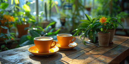 Two cups of coffee on a rustic table surrounded by potted plants and sunlight in a cozy indoor garden.