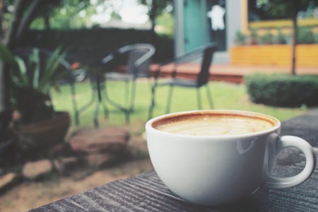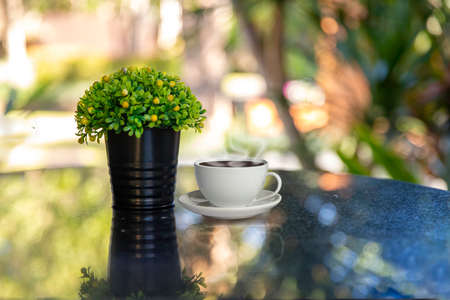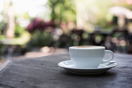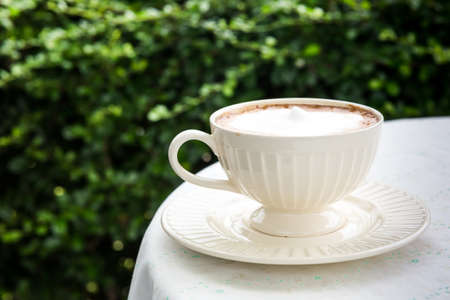 White cup of hot coffee with white plate on the plant green nature background in vintage tone. shallow focus