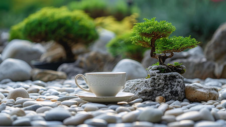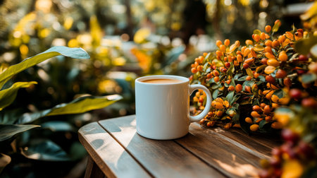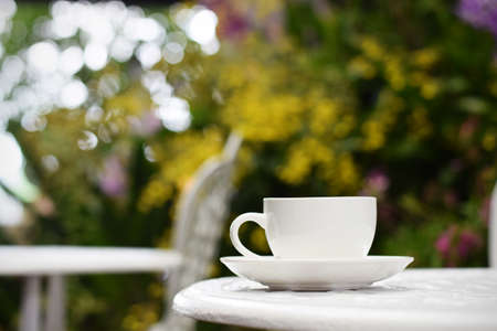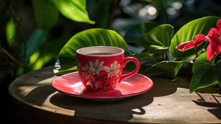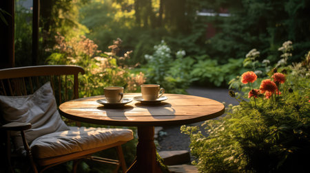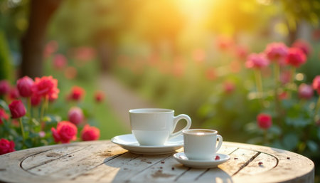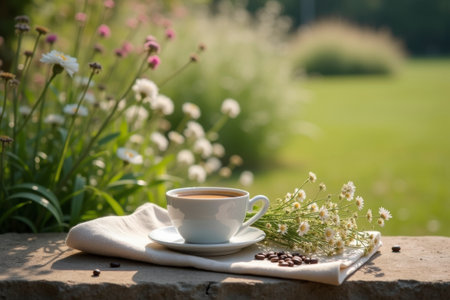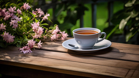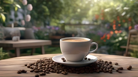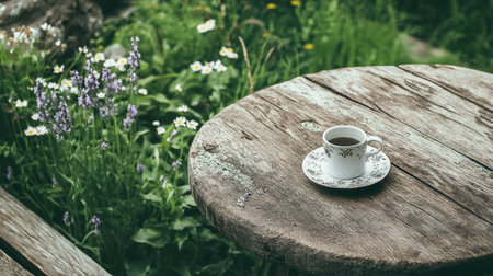 A charming outdoor scene featuring a delicate coffee cup placed on a rustic wooden table amidst a lush garden filled with blooming flowers.