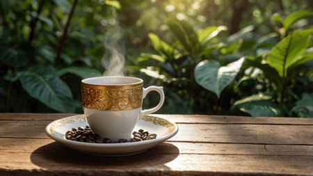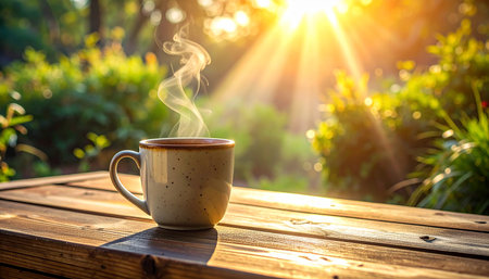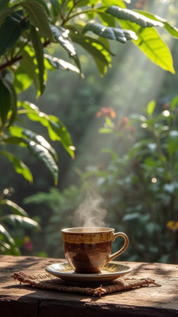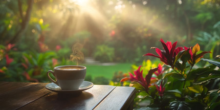 A steaming cup of coffee sits on a wooden table, bathed in sunlight streaming through vibrant tropical foliage, creating a serene morning atmosphere in a beautiful garden.