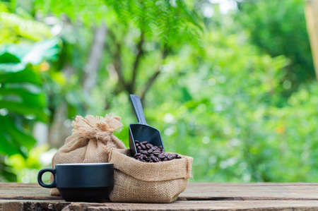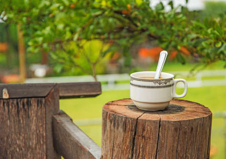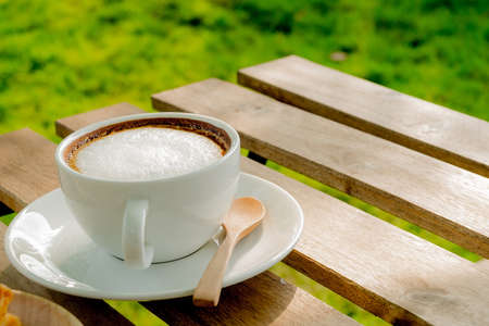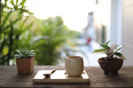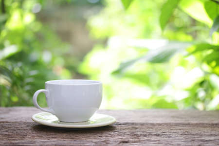 Coffee cup on the wooden table and green bokeh background in the morning sunrise.