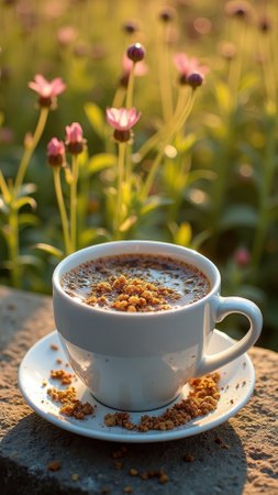 Warm cup of coffee with crumbled biscotti in sunlit garden with blooming flowers. That the image is generated using AI.