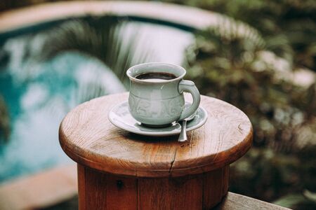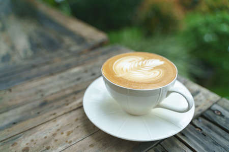 Cup of coffee with latte art pattern milk foam on balcony in the tropical garden with raining storm
