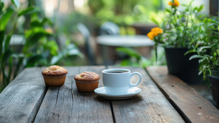 A wooden table at a nature caf with a cup of tea, freshly baked muffins, and a soft focus of surrounding green plants and flowers.