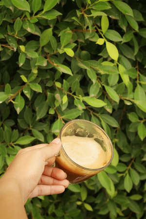 Cup of Coffee on green palm leaves background in tropical garden. Summer Coffee