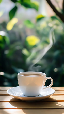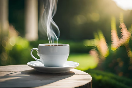 AI Generated. Steaming coffee cup in a lush green garden setting with sunlight