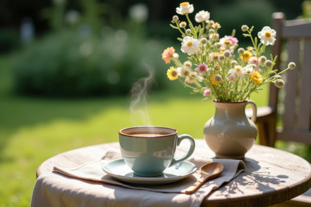 An idyllic still life with a steaming cup of coffee on a wooden table in the garden. Next to it stands a white vase with colorful summer flowers, emphasizing the warm and peaceful outdoor atmosphere.