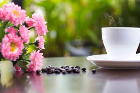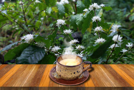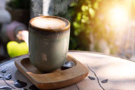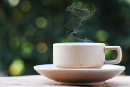 Hot Coffee Drink Concept, Hot ceramic white coffee cup with smoke on an old wooden table in a natural background.