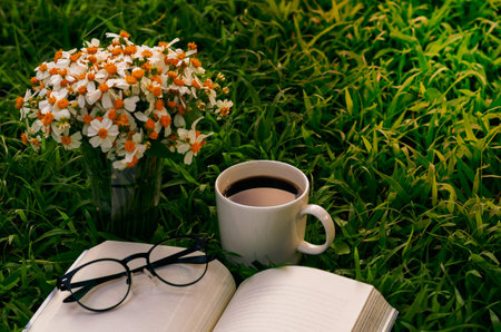 Leisure in morning at garden with coffee, book and flowers on the lawn.
