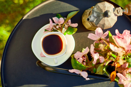 Top view Cup of coffee flowers and notebook on the small black table on terrace at home in a sunny day, outdoor workspace, summer relaxation, coffee break.