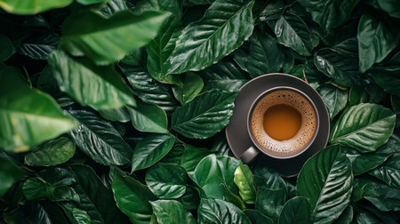 A cup of coffee resting on a bed of lush green leaves, creating a serene and natural atmosphere. Perfect for themes of relaxation, nature, and coffee culture.