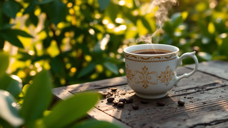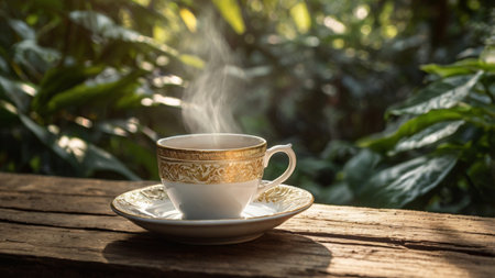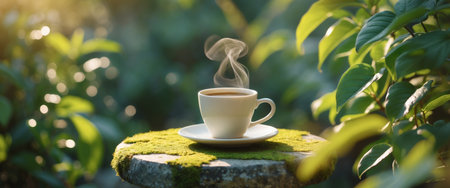 Steaming cup of coffee amidst lush greenery in sunlit garden. That the image is generated using AI.