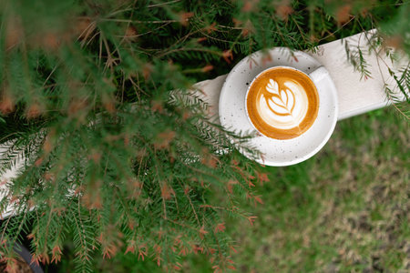 Cup of coffee with heartshaped latte art nestled among vibrant green foliage