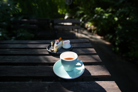 blue coffee cup and Dessert with coffee Strawberry Cheesecake on grunge wooden table outdoor chilling