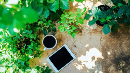 A serene top view of a tablet beside a coffee cup, surrounded by lush green plants. This image portrays a perfect blend of technology and nature, ideal for relaxation.