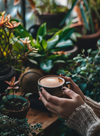 Woman Holding A Cup Of Coffee With Latte Art In A Cozy Cafe, Surrounded By Lush Greenery