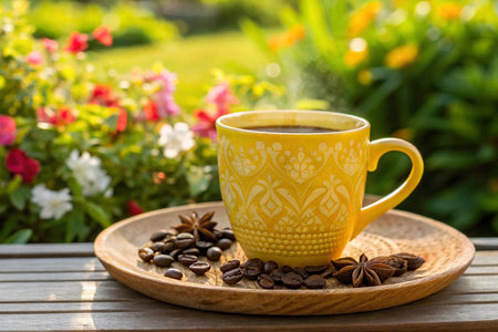 Steaming Cup of Coffee on a Rustic Wooden Table in a Lush Garden Setting with Vibrant Flowers