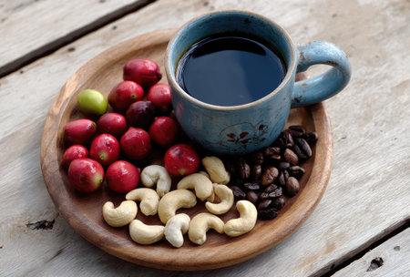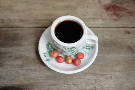 Hot coffee vintage cup with fresh organic red coffee beans on the wooden table