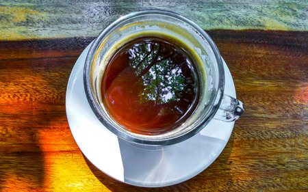 Glass pot cup of americano black coffee with spoon and plate on a table in the restaurant cafe in Playa del Carmen Quintana Roo Mexico.