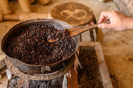 Cropped shot view of woman hill tribe hand trying to roasting coffee beans by traditional local ways, using metal pot and wooden spatula. Roasting brings out the aroma and flavor inside coffee beans.