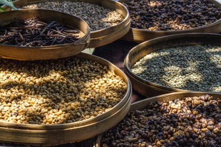 Various varieties of Luwak coffee beans on a production plantation, Bali, Indonesia