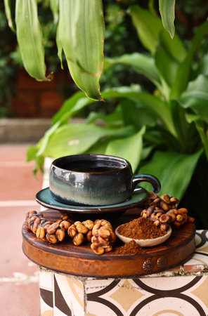 Kopi Luwak Coffee Bean or Civet coffee bean with Cup of Kopi Luwak coffee, world's most expensive coffee from indonesia