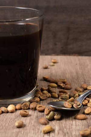 Glass of Black Coffee and roasted coffee beans on the wooden Table