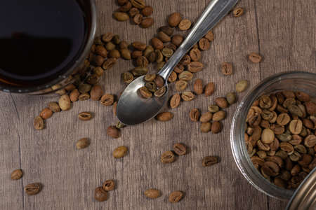 glass cup with coffee, jar with seeds a spoon and coffee seeds on a wooden board.