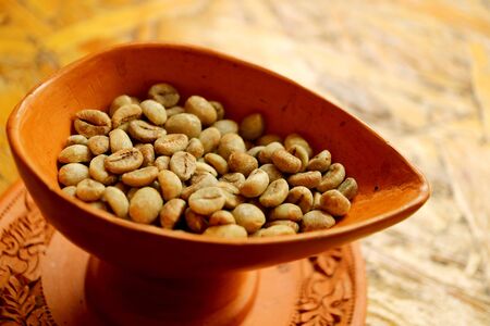 Closeup raw coffee beans in a Thai style terracotta bowl for homemade coffee