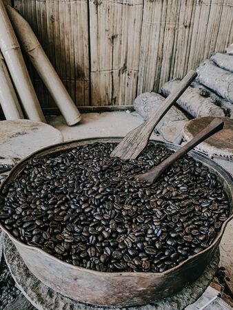 Traditional method of coffee roasting coffee farm on wood burning stove Bali, Indonesia