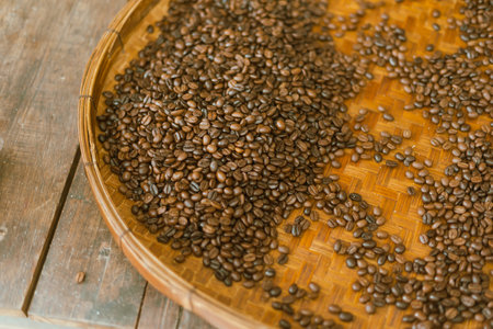 Coffee bean after roasted on bamboo plate, tradition roasted, home roasted