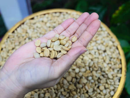 Dry white coffee bean in lady hand - people with fresh coffee bean nature concept