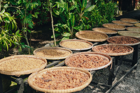 Luwak Coffee Beans drying in the basket in coffe plantation in Ubud, Bali island. Authentic organic luwak coffee beans in nature.