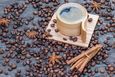 Coffee style, Cup of coffee and coffee beans roating with old wooden scoop and coffee beans around on the wooden and dark stone background. Oblique view from the top with copy space for your text.