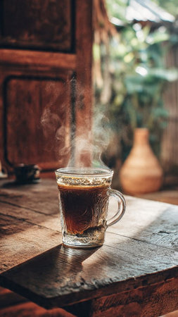 Coffee in a glass cup on a wooden table. Cup of coffee with steam.