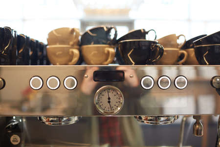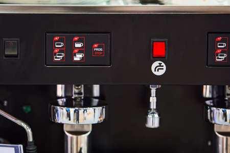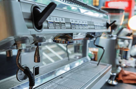 Professional coffee machine in coffee shop close up