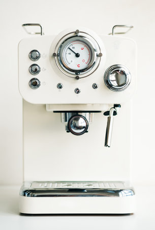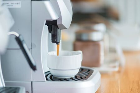 Espresso coffee machine with white ceramic cup on the kitchen