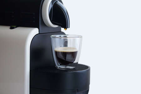 coffee machine pours espresso into a transparent cup, side view