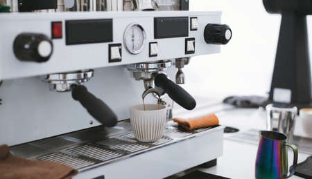Professional coffee maker machine brewing fresh espresso coffee in cafe. blur image for background