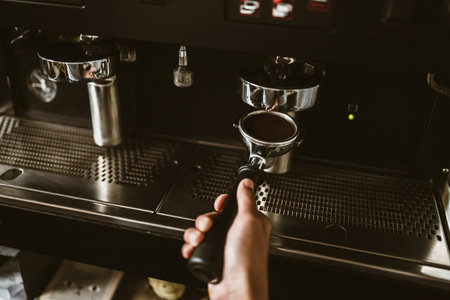 Barista making coffee in a coffee machine