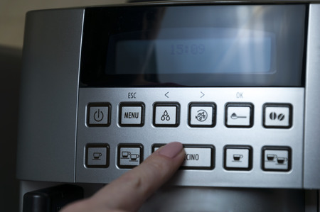 Woman's hand. Woman presses the Cappuccino button on the display of the coffee machine.