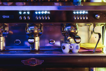 Rovigo, Italy 18 December 2025: wega commercial espresso machine preparing two cups of coffee, featuring illuminated control panel and stainless steel details