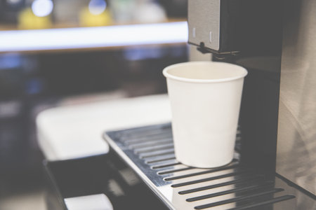 A white paper cup stands on the coffee machine stand, cozy atmosphere of a coffee shop, selective soft focus.