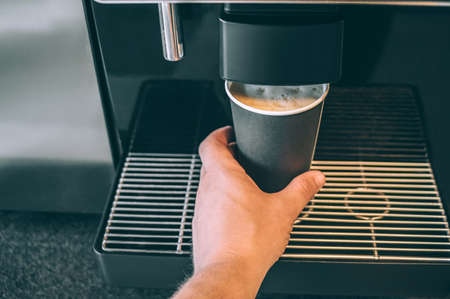 Man hand with coffee, vending coffee machine