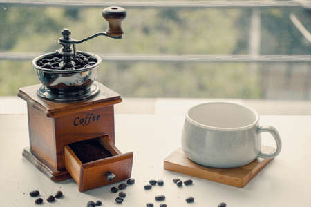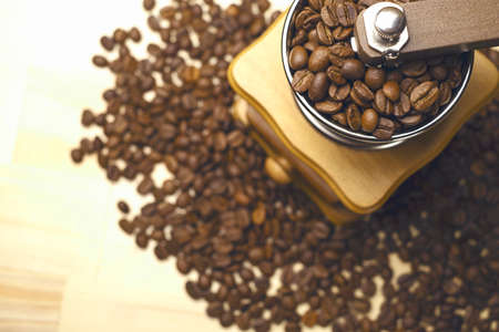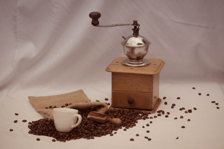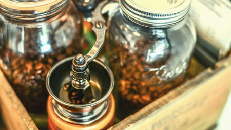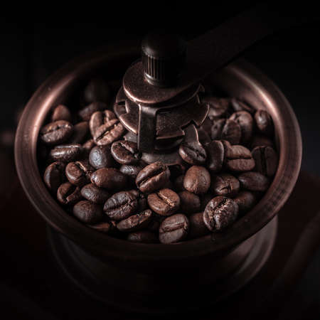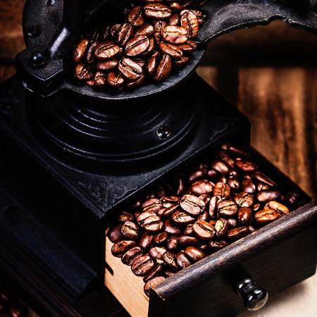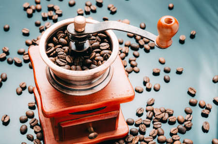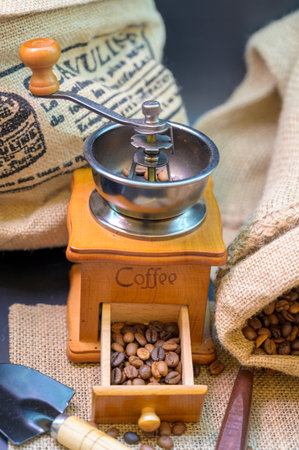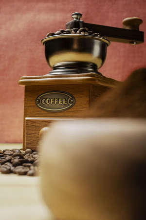 Vintage manual coffee grinder or coffee mill with coffee beans