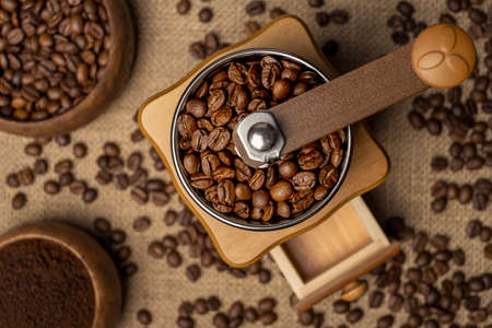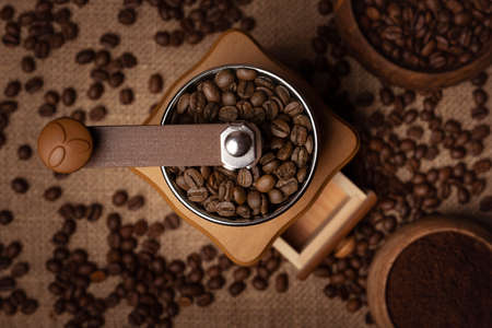 grinded coffee in old coffee grinder and coffee beans on jute