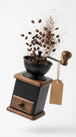 A classic vintage coffee grinder elegantly suspended, with coffee beans and grounds dramatically flying around, capturing the essence of coffee preparation and aroma