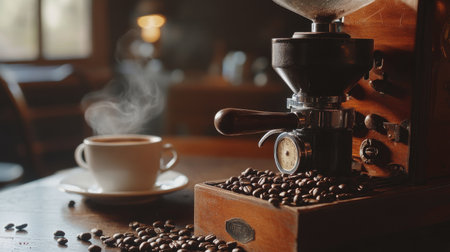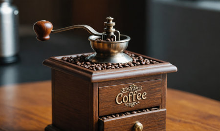 A vintage coffee grinder sits on a wooden table, ready to grind fresh coffee beans for the perfect cup